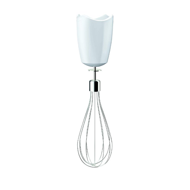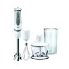 Metal blending shaft, 500 ml chopper, and metal whisk; plus 600 ml plastic beaker is BPA free and features ml and fl oz measurement markings.